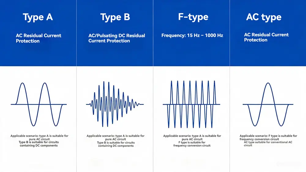 | Vrsta preostalega toka | Vrsta AC | Sinusni AC preostali tok; za splošno razsvetljavo, vtičnice in uporovne obremenitve. |